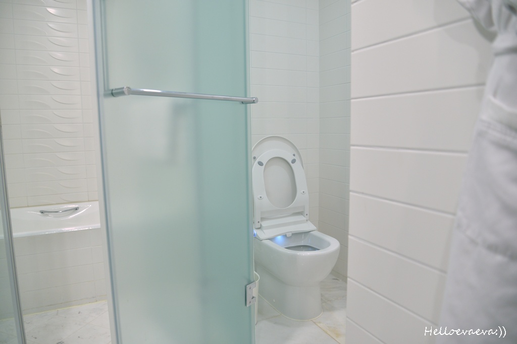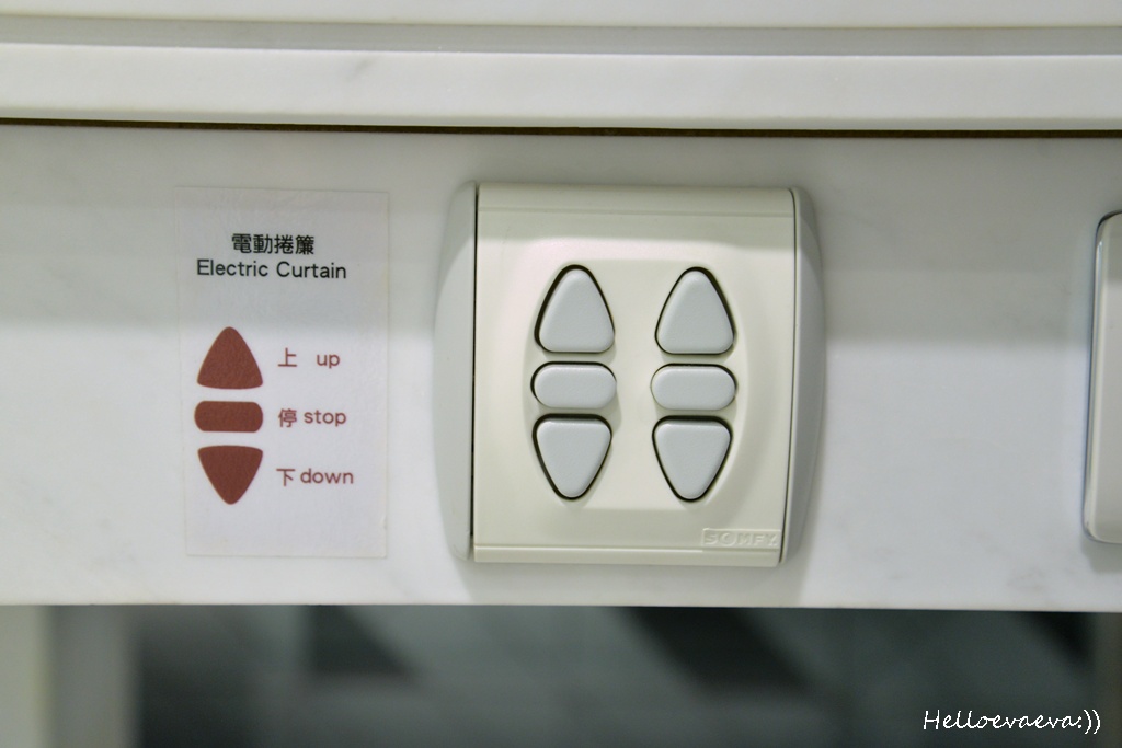 浴室是乾濕分離設計,這點我超喜歡!廁所和淋浴區可以分開使用,特別是,化妝鏡後方還藏有電動窗簾,只要按一下按鈕就能升降遮簾,如果不想讓外面看到洗手間,就能輕鬆拉下來,覺得超酷!