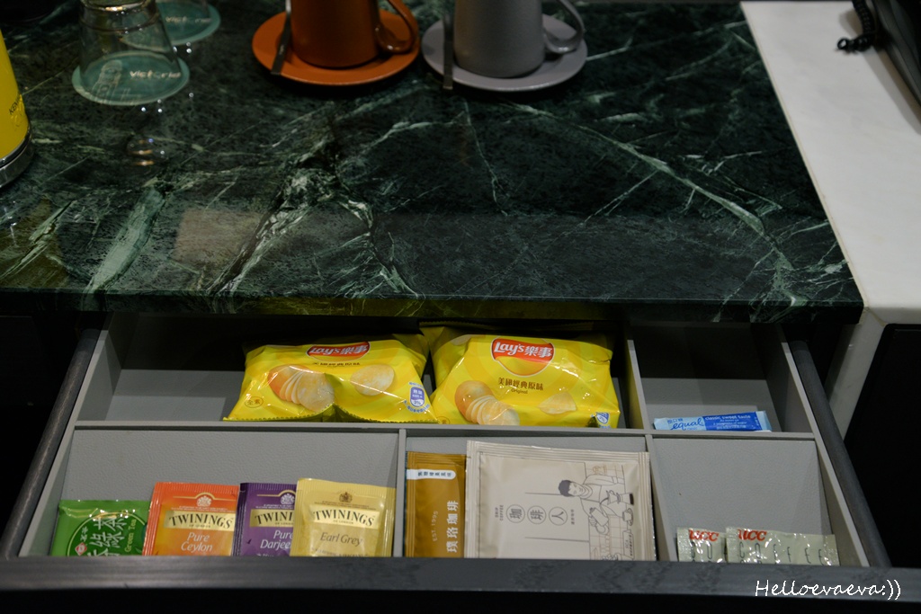 冰箱裡的飲料和瓶裝水都是免費的,抽屜裡還貼心準備了餅乾、零嘴、咖啡和茶包,全部都能免費享用,真的超棒!